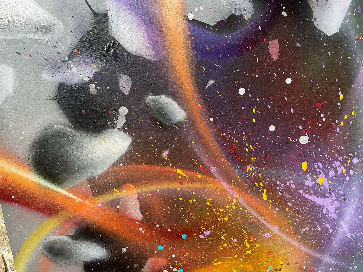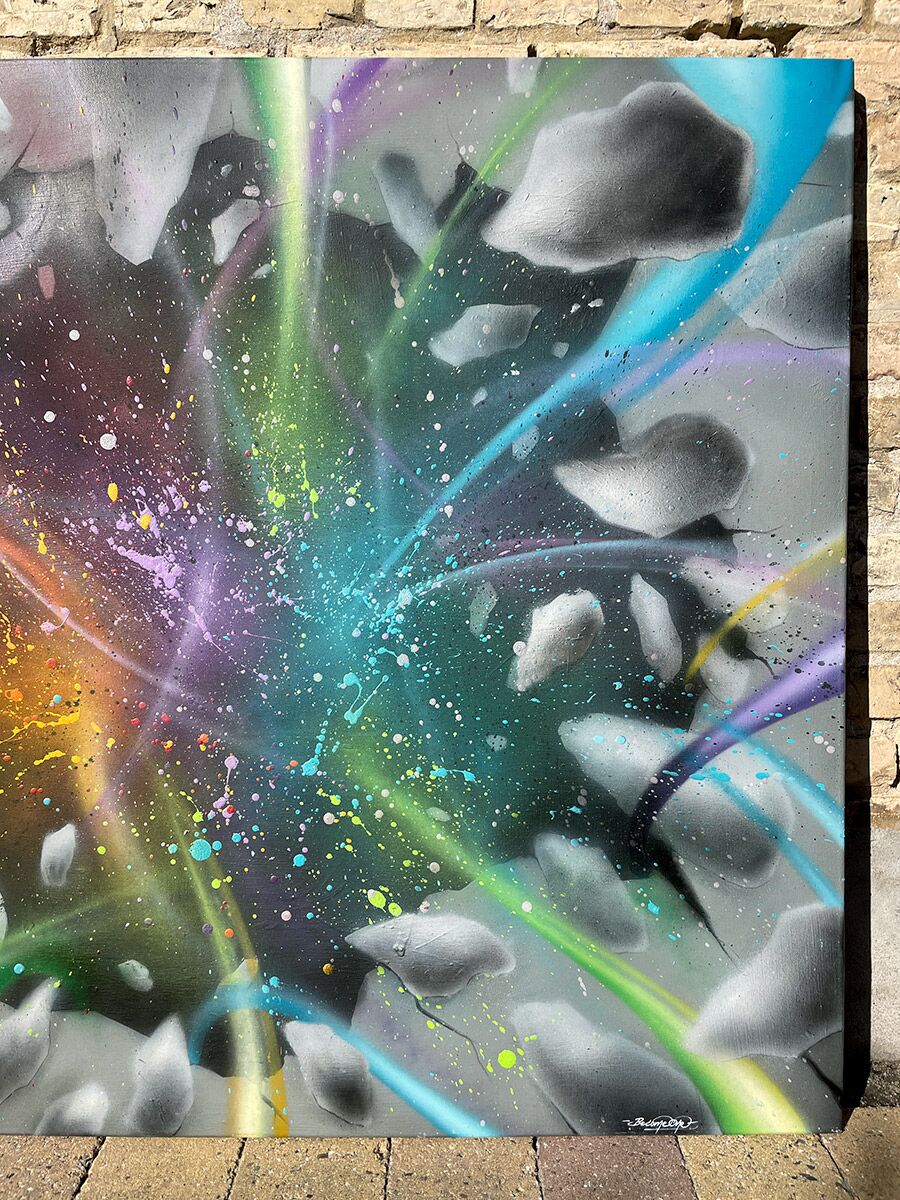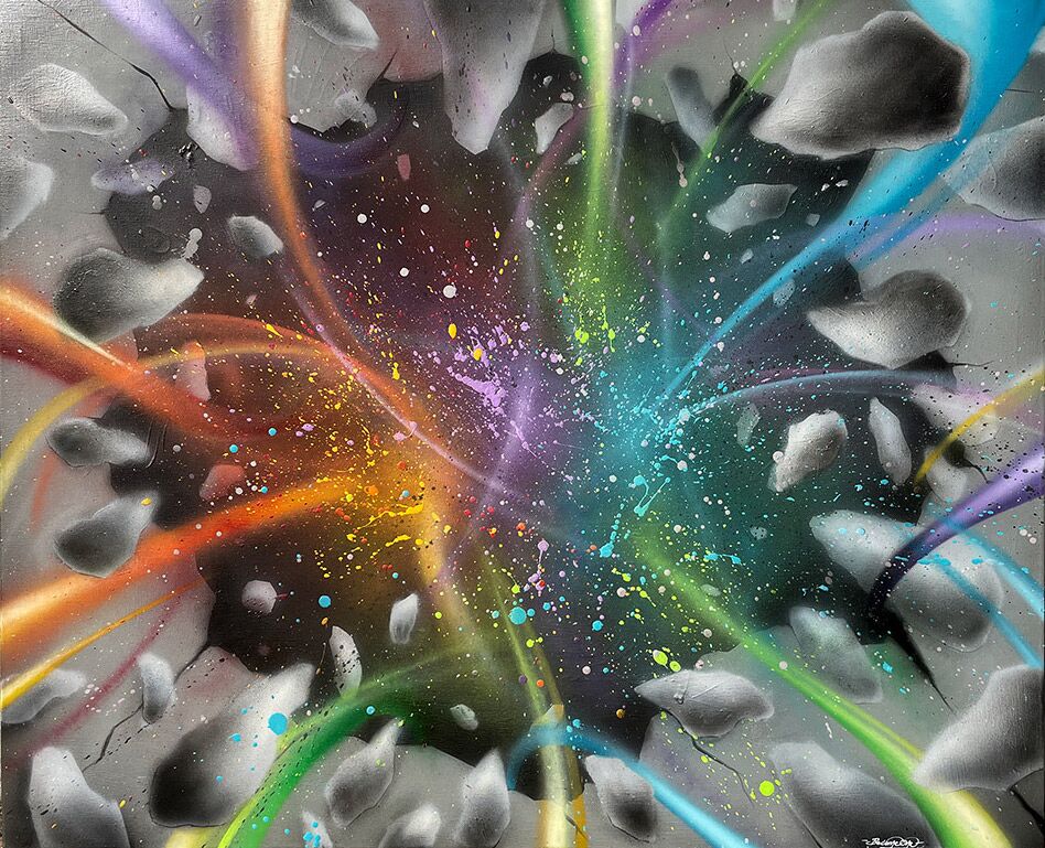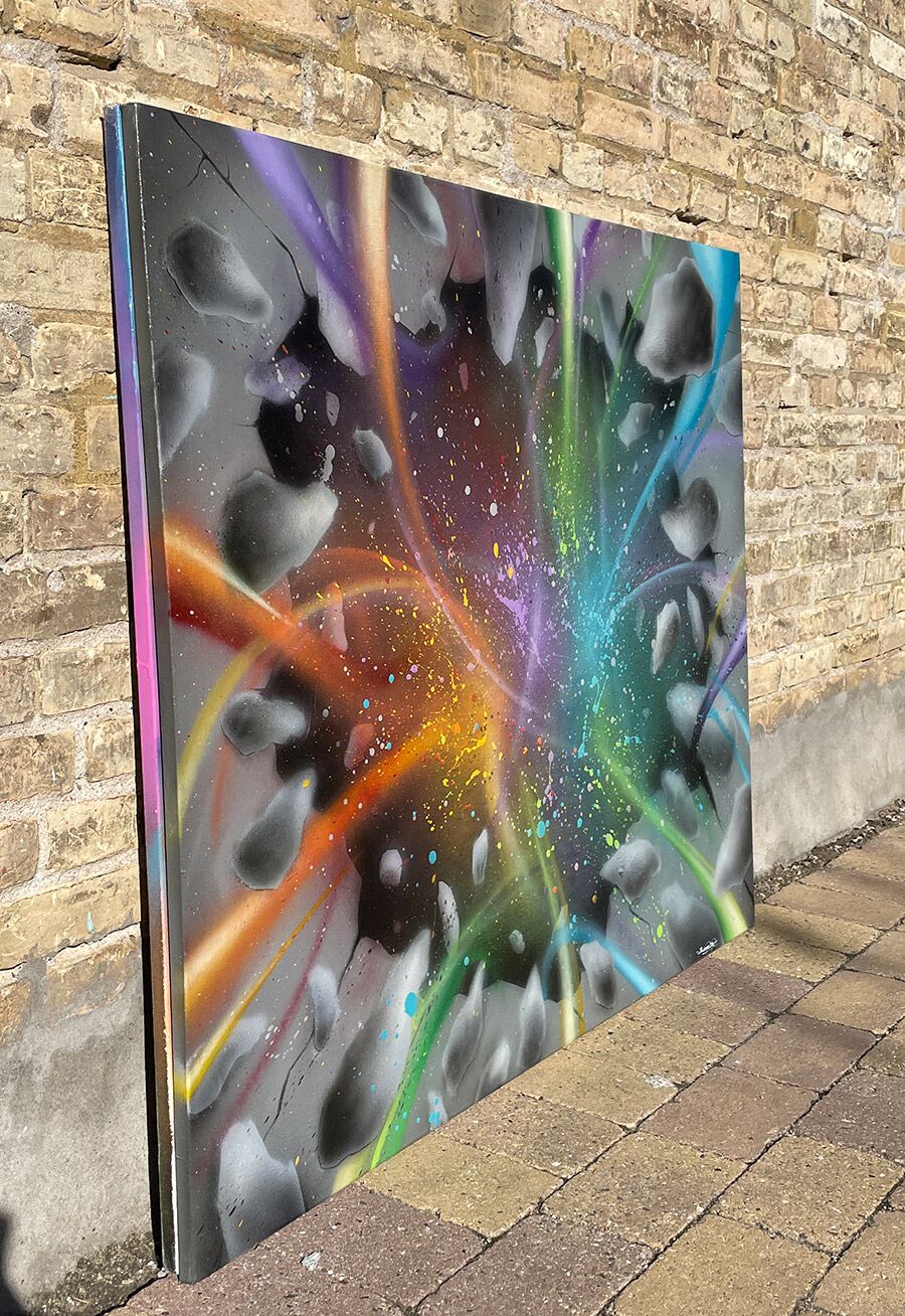 Dette abstrakte graffiti maleri på lærred er en ren eksplosion af kulørte farver, som kan bringe liv og kulør til enhver væg i hjemmet. Maleriet er malet med spray og paint-splat teknik. Maleriet er malet med spray, og måler 120 x 100 cm.