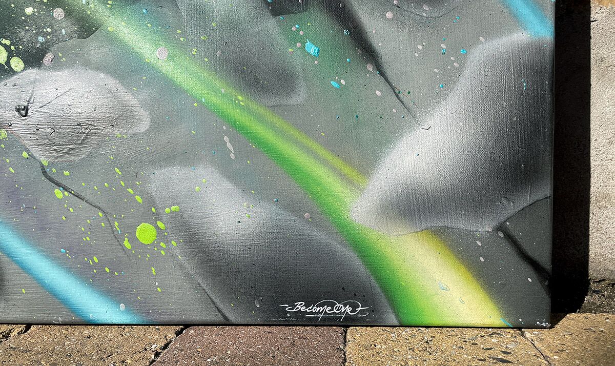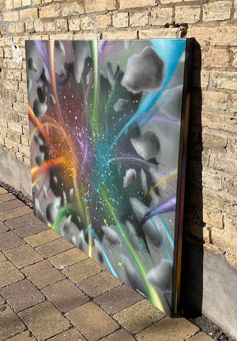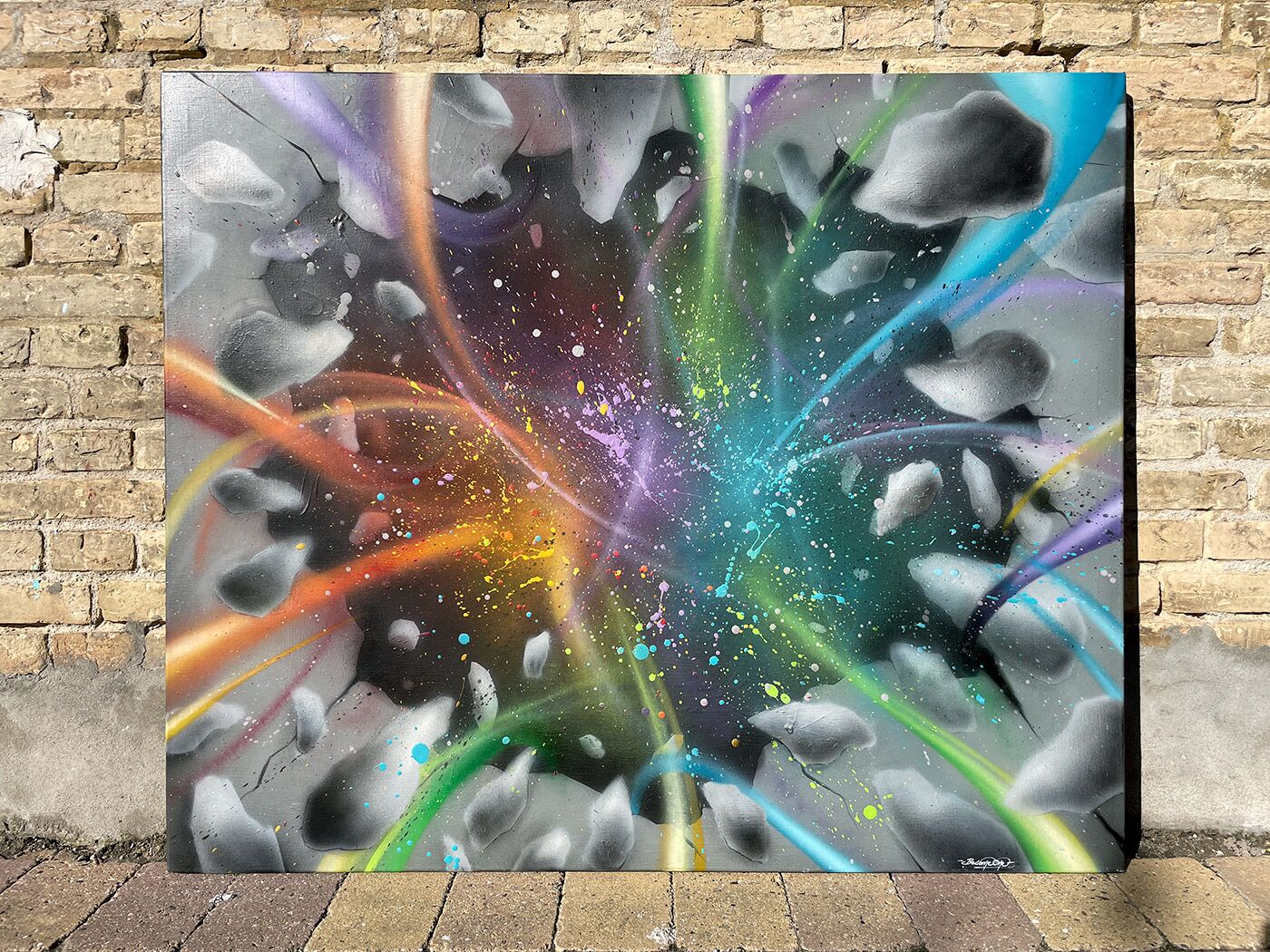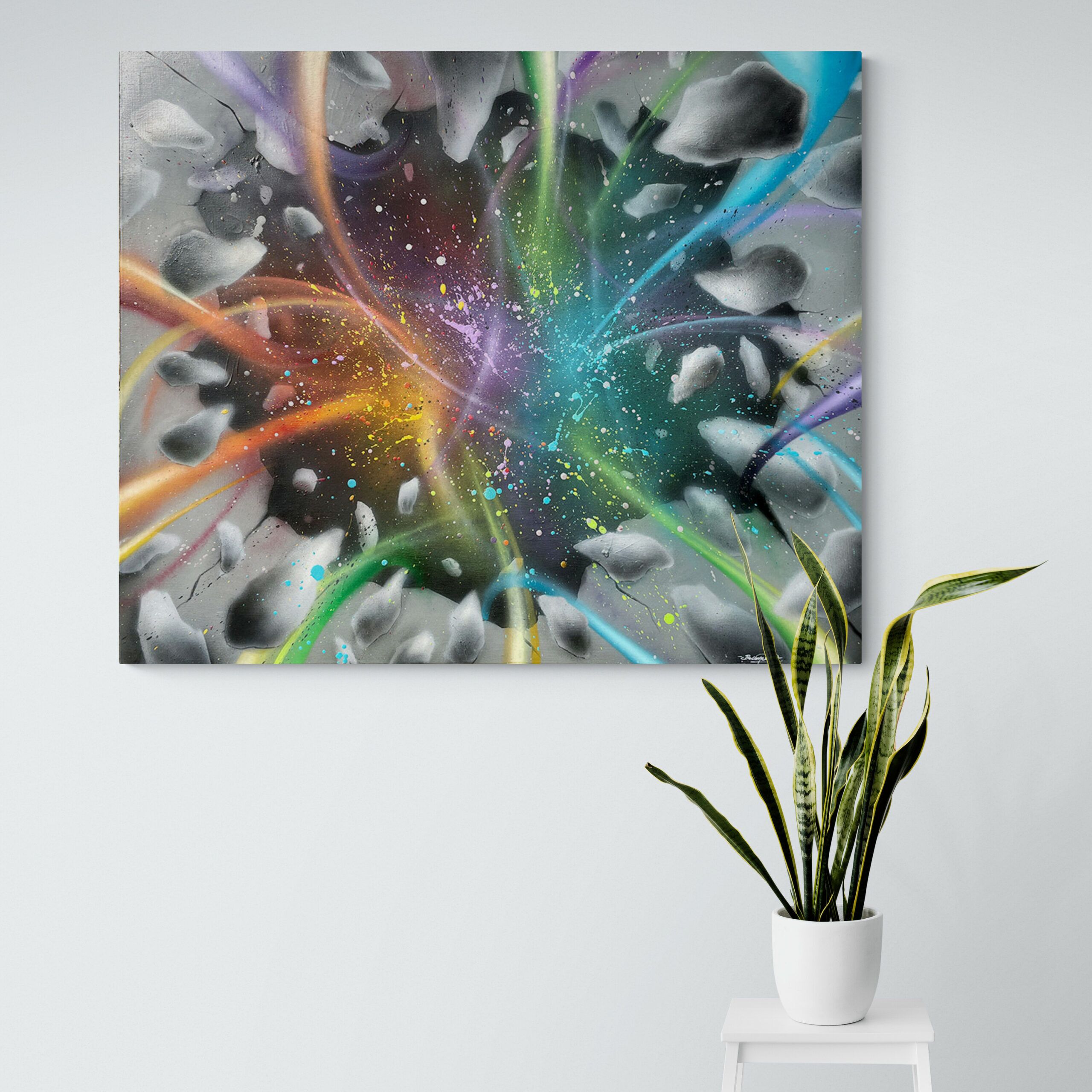 Dette abstrakte graffiti maleri på lærred er en ren eksplosion af kulørte farver, som kan bringe liv og kulør til enhver væg i hjemmet. Maleriet er malet med spray og paint-splat teknik. Maleriet er malet med spray, og måler 120 x 100 cm.