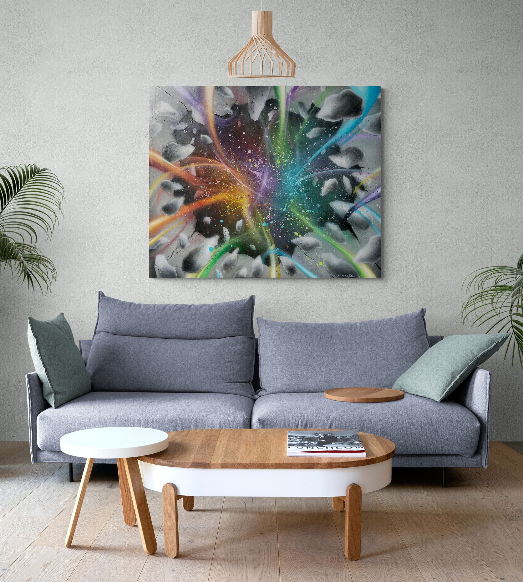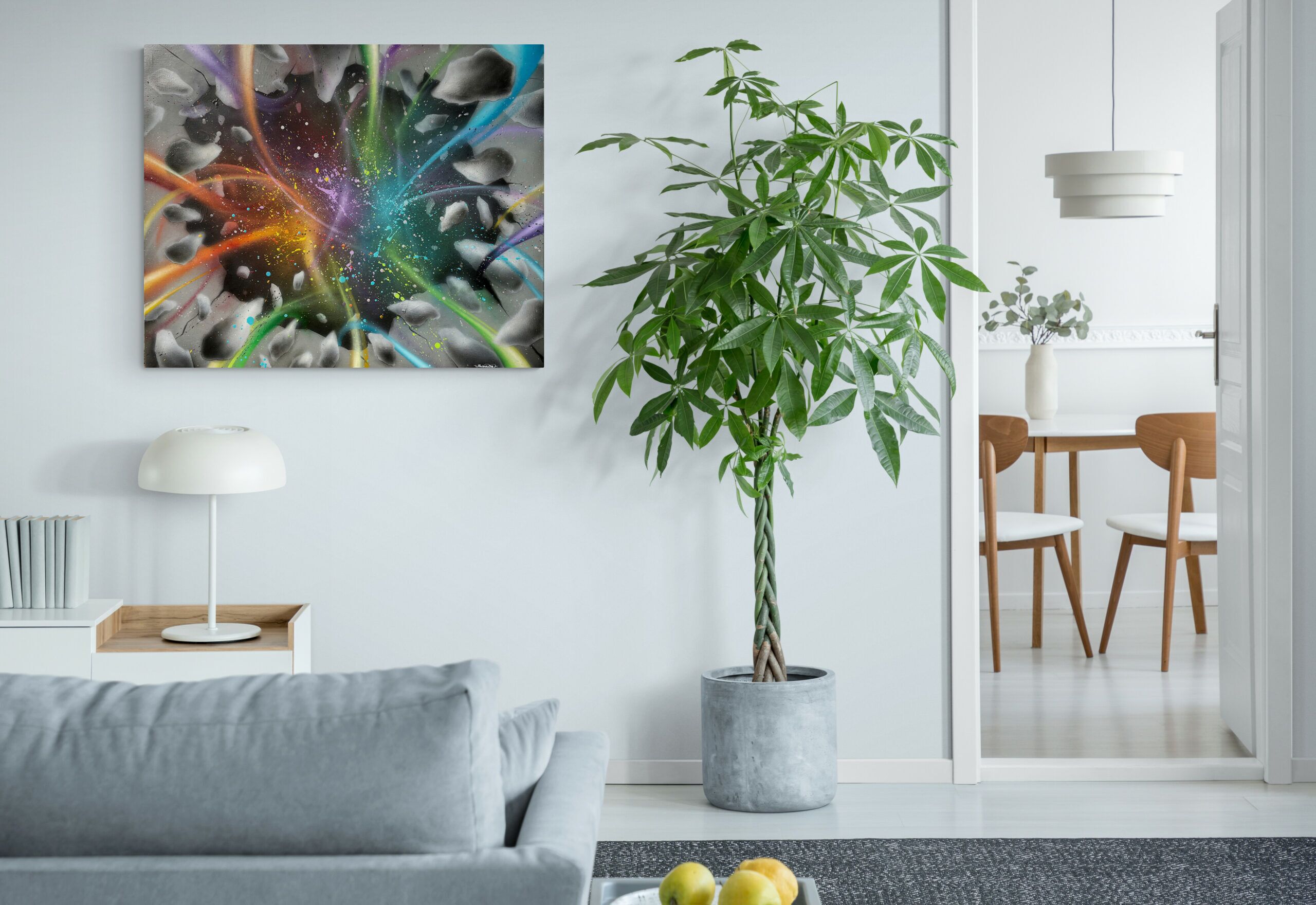 Dette abstrakte maleri er en ren eksplosion af kulørte farver, som kan bringe liv og kulør til enhver væg i hjemmet. Maleriet er malet med spray og paint-splat teknik. Dette abstrakte graffiti maleri på lærred er en ren eksplosion af kulørte farver, som kan bringe liv og kulør til enhver væg i hjemmet. Maleriet er malet med spray og paint-splat teknik. Maleriet er malet med spray, og måler 120 x 100 cm.