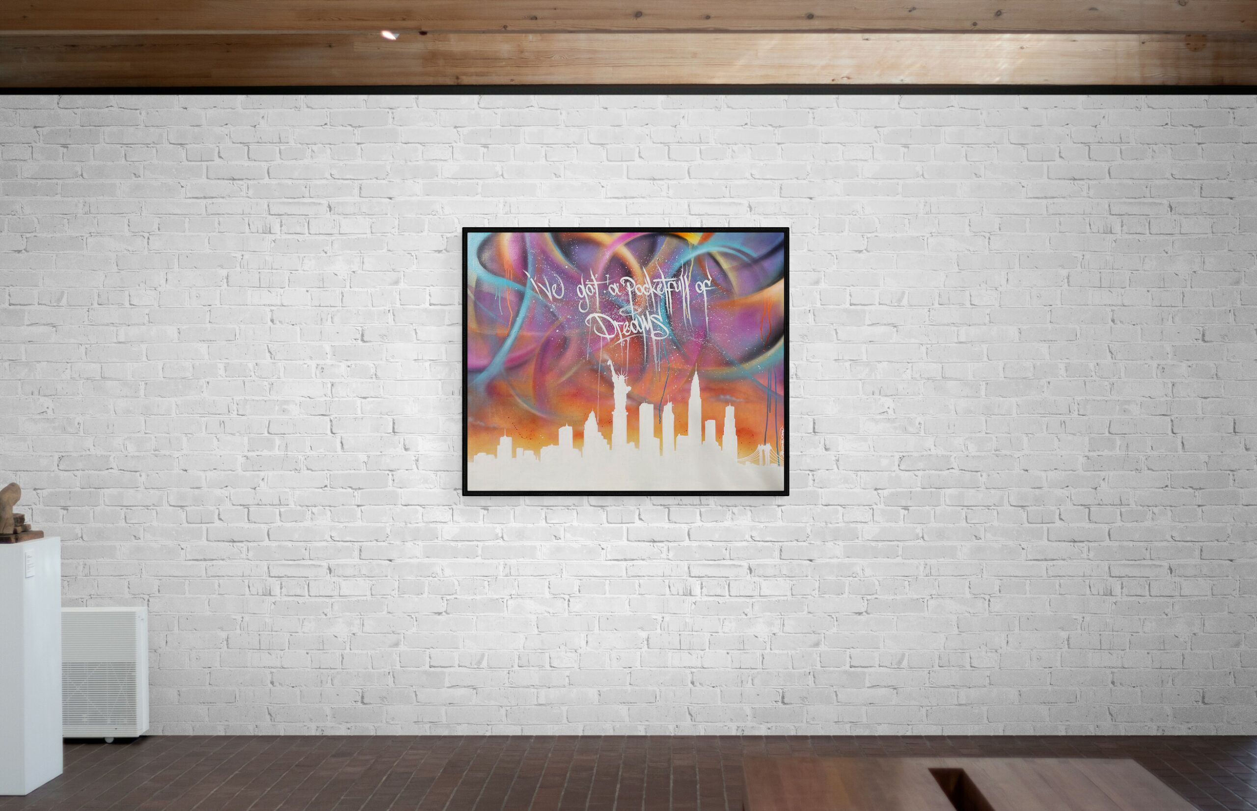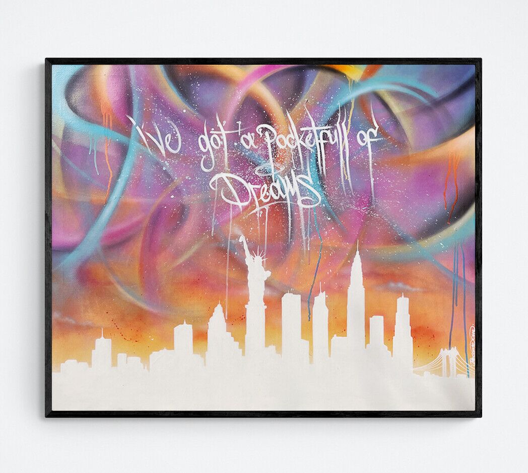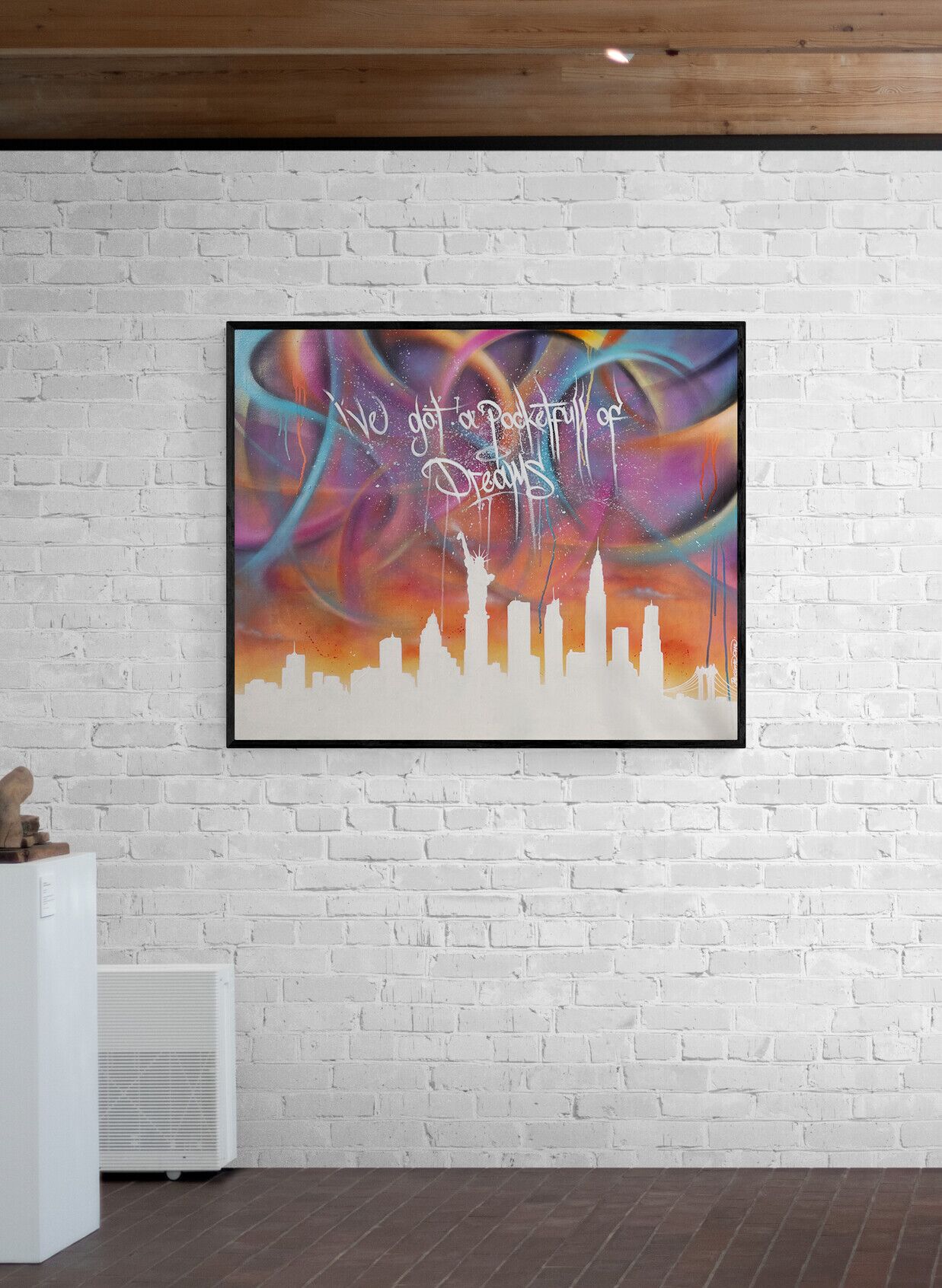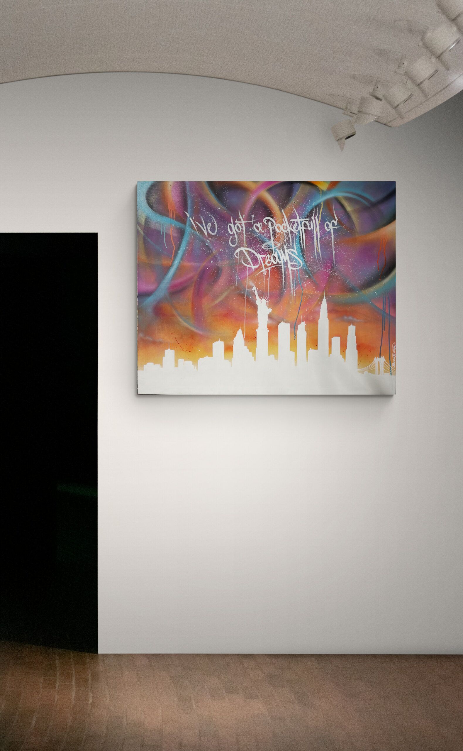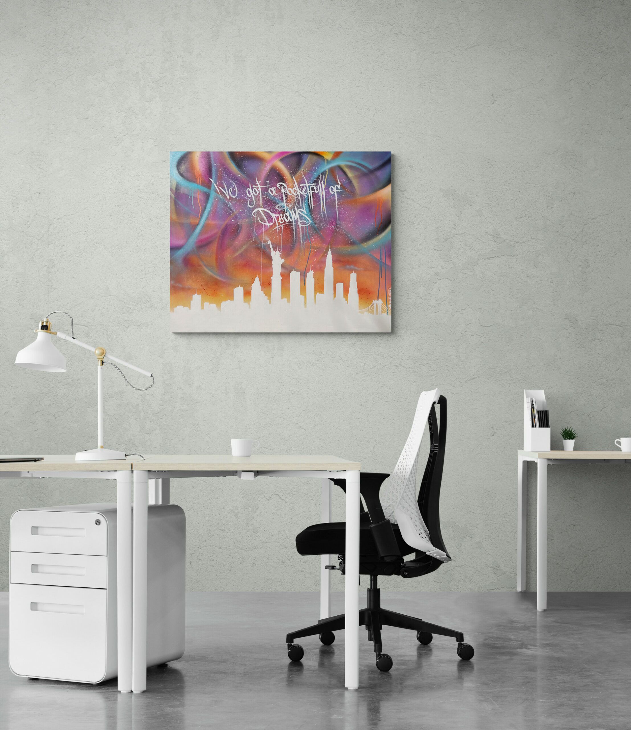 “I`ve got a pocketfull of dreams” – originalt maleri af New York skyline kombineret med en flot og farverig abstrakt graffiti baggrund. Passer perfekt til væggen på kontoret eller hjemmearbejdspladsen.
