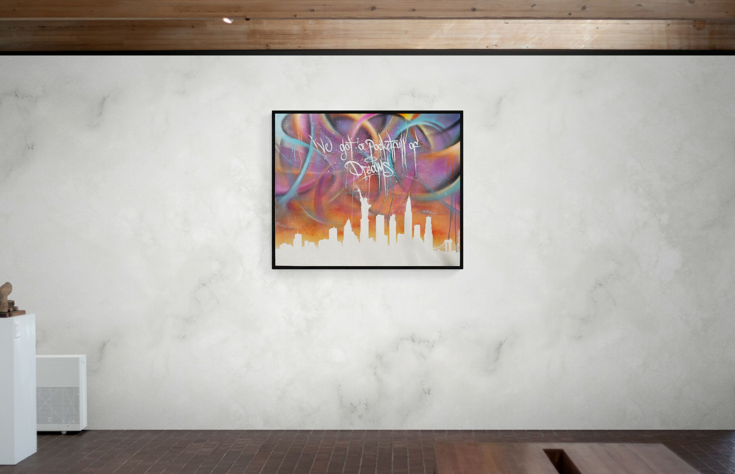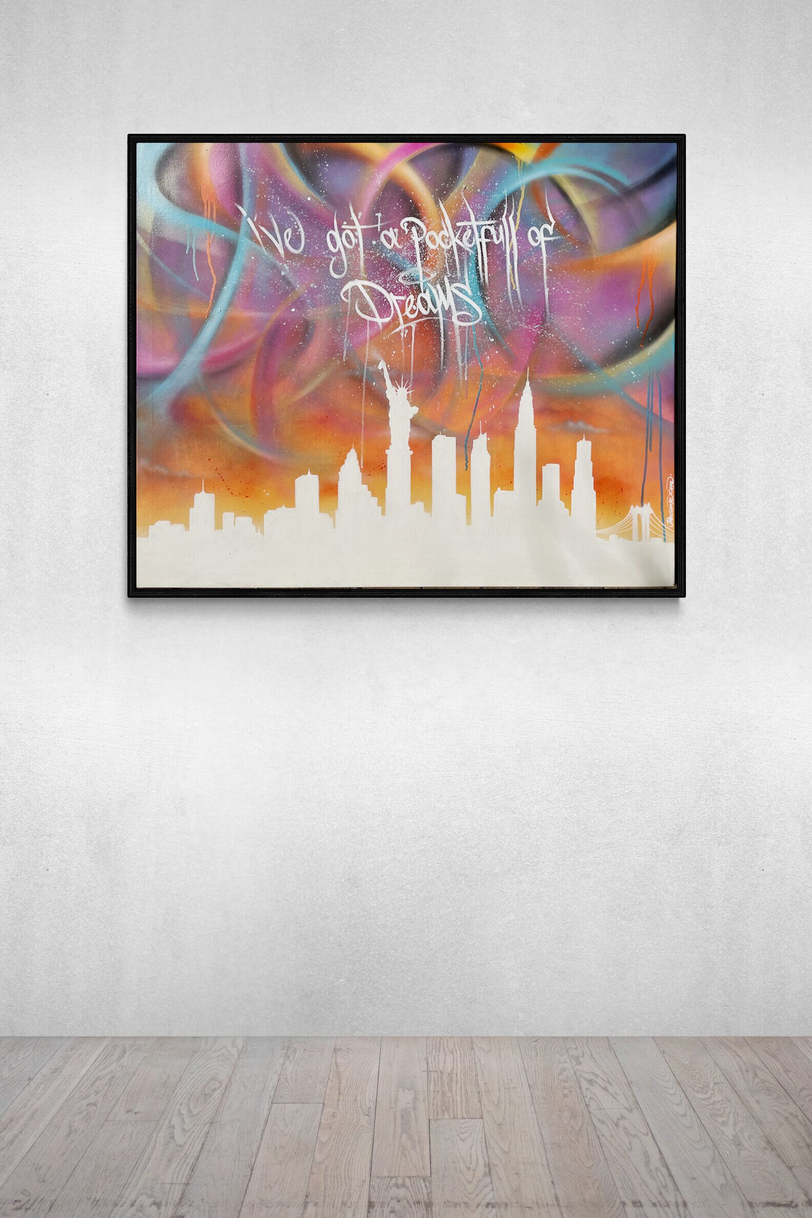 "I`ve got a pocketfull of dreams" - originalt maleri af New York skyline kombineret med en flot og farverig abstrakt graffiti baggrund. Passer perfekt til væggen på kontoret eller hjemmearbejdspladsen.