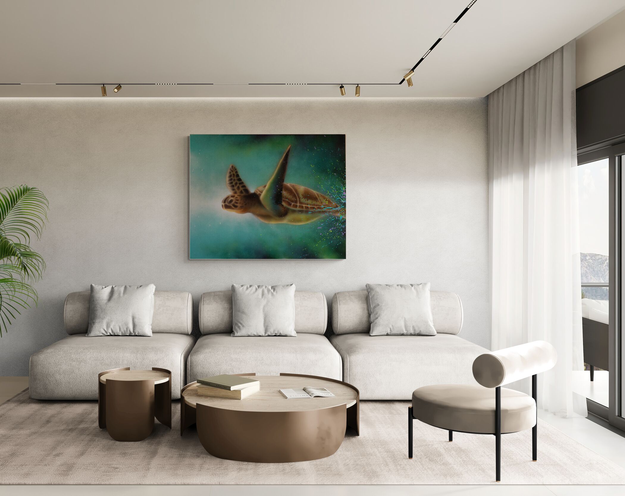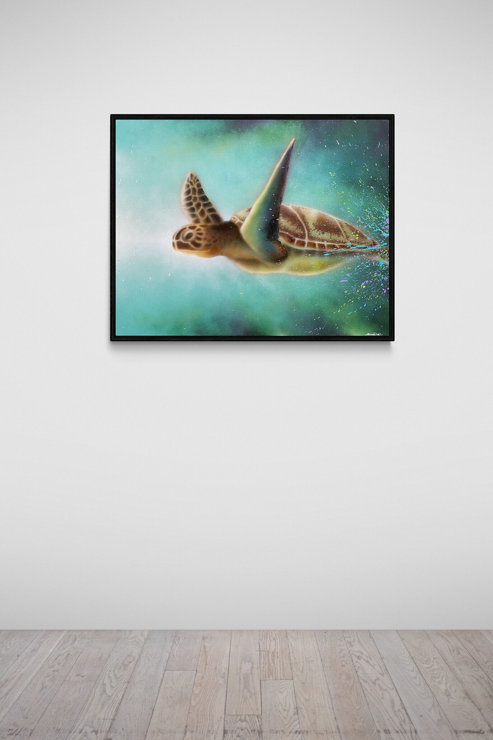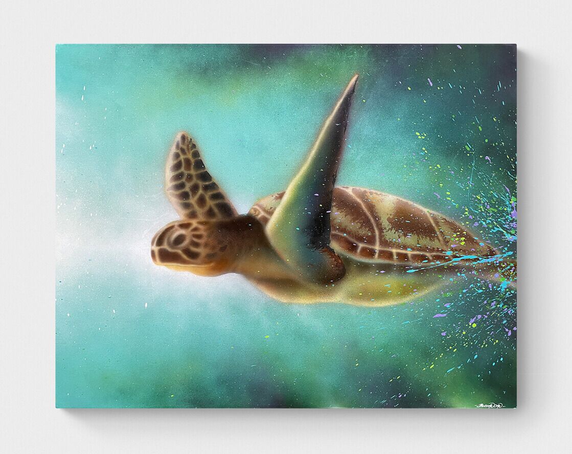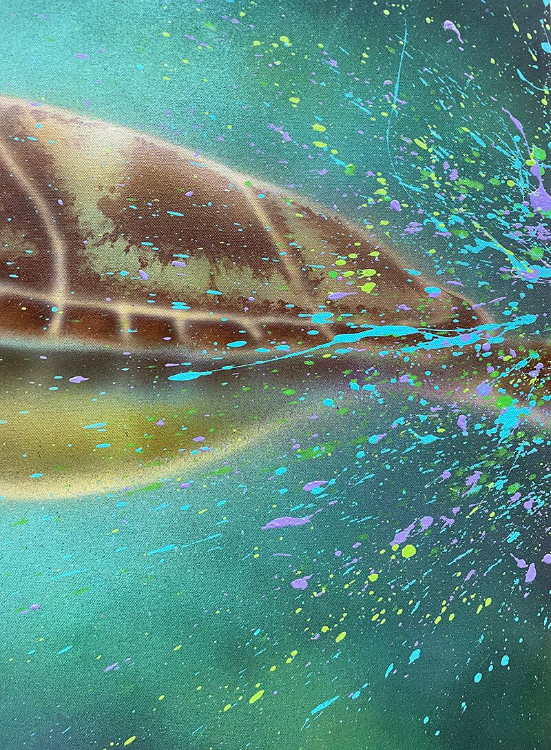 Inspirationen til dette maleri kom til mig fra udtrykket “slow progress is better than no progress” – skildpadden bærer hele verden på ryggen, uanset hvor den går. Skildpadden er beslutsom og vedholdende, mens den langsomt bevæger sig gennem livet i havet og på landjorden.
