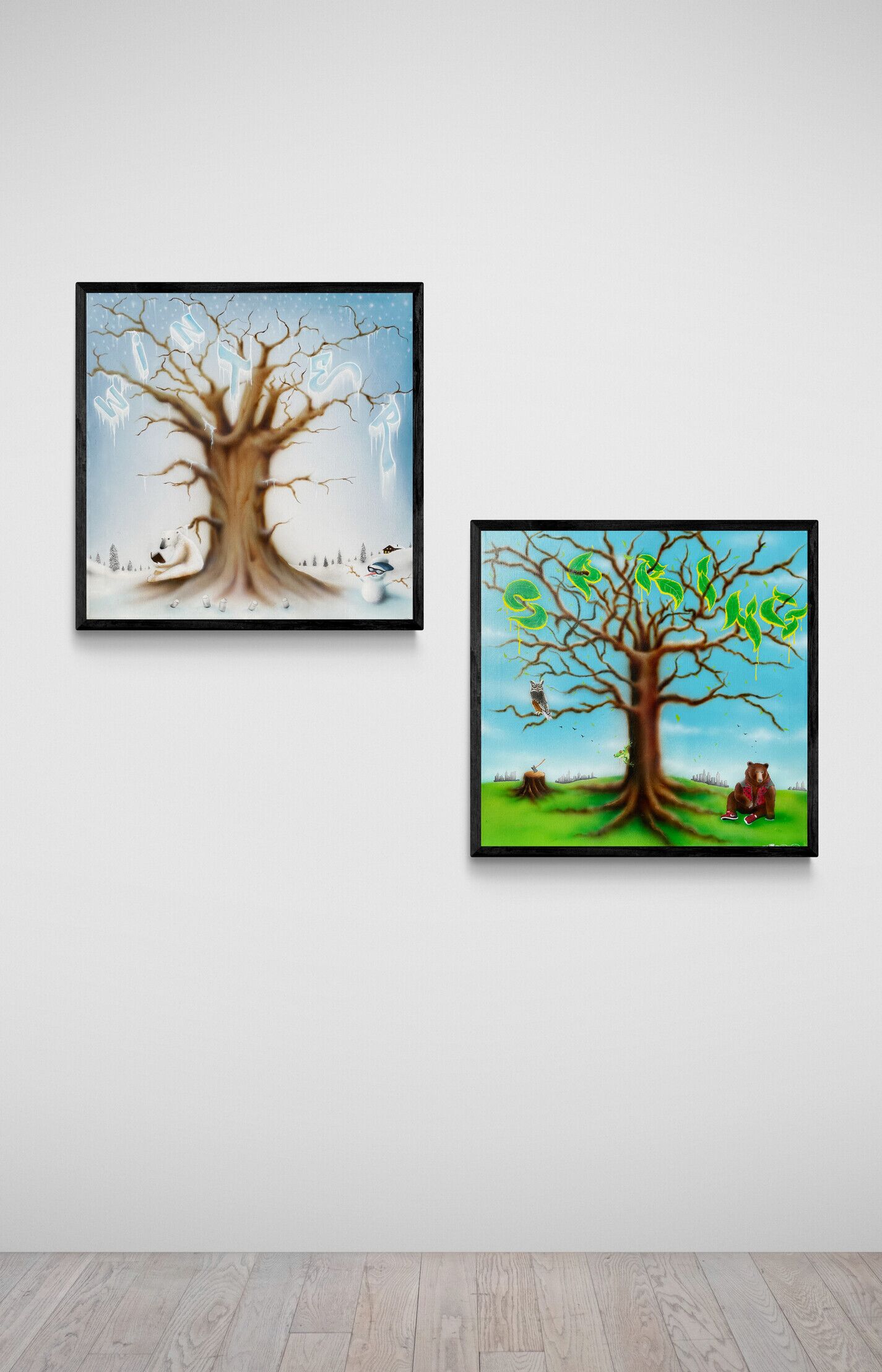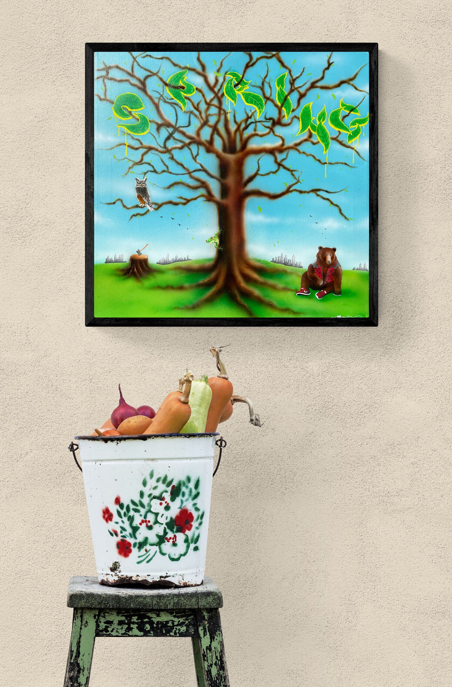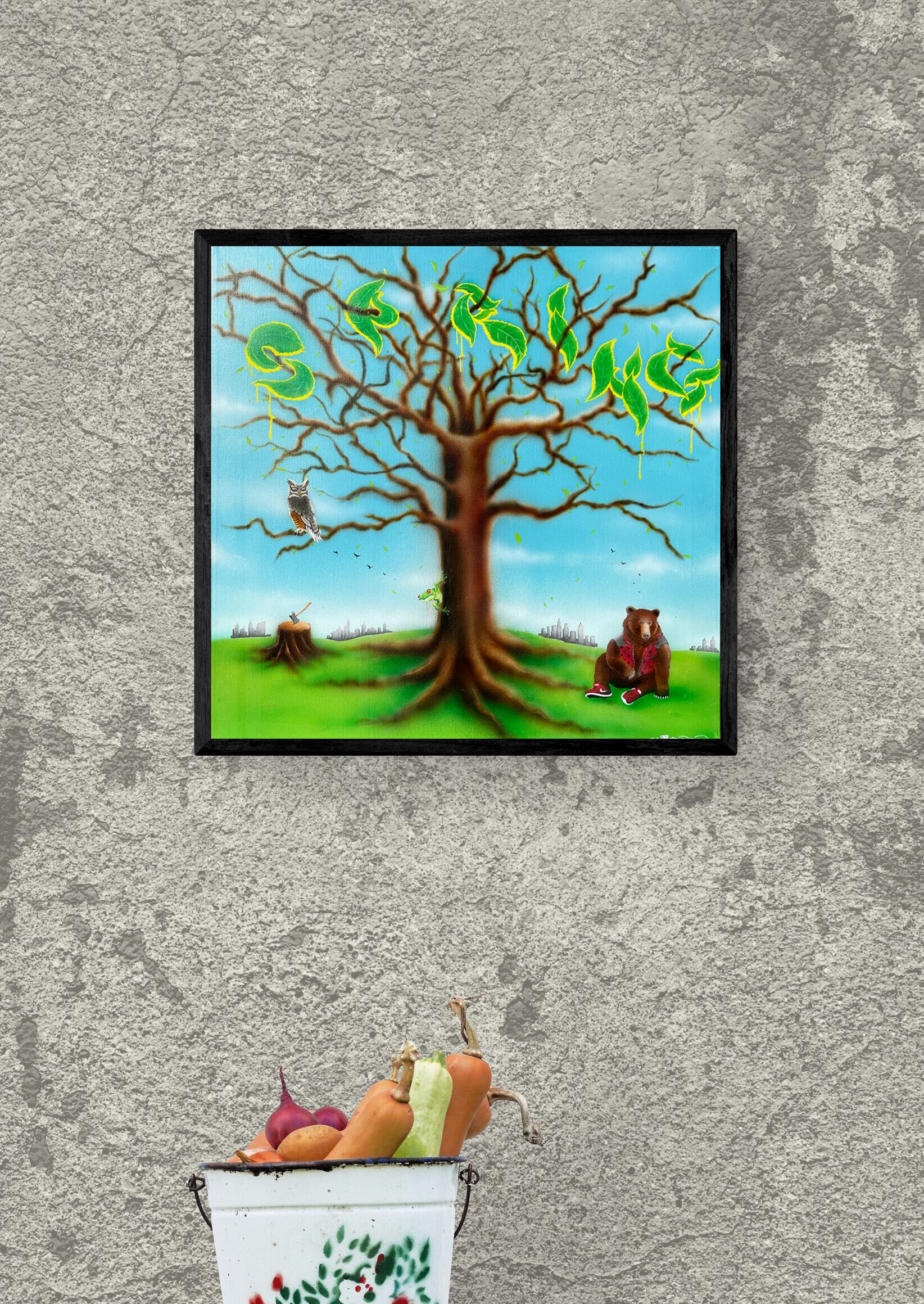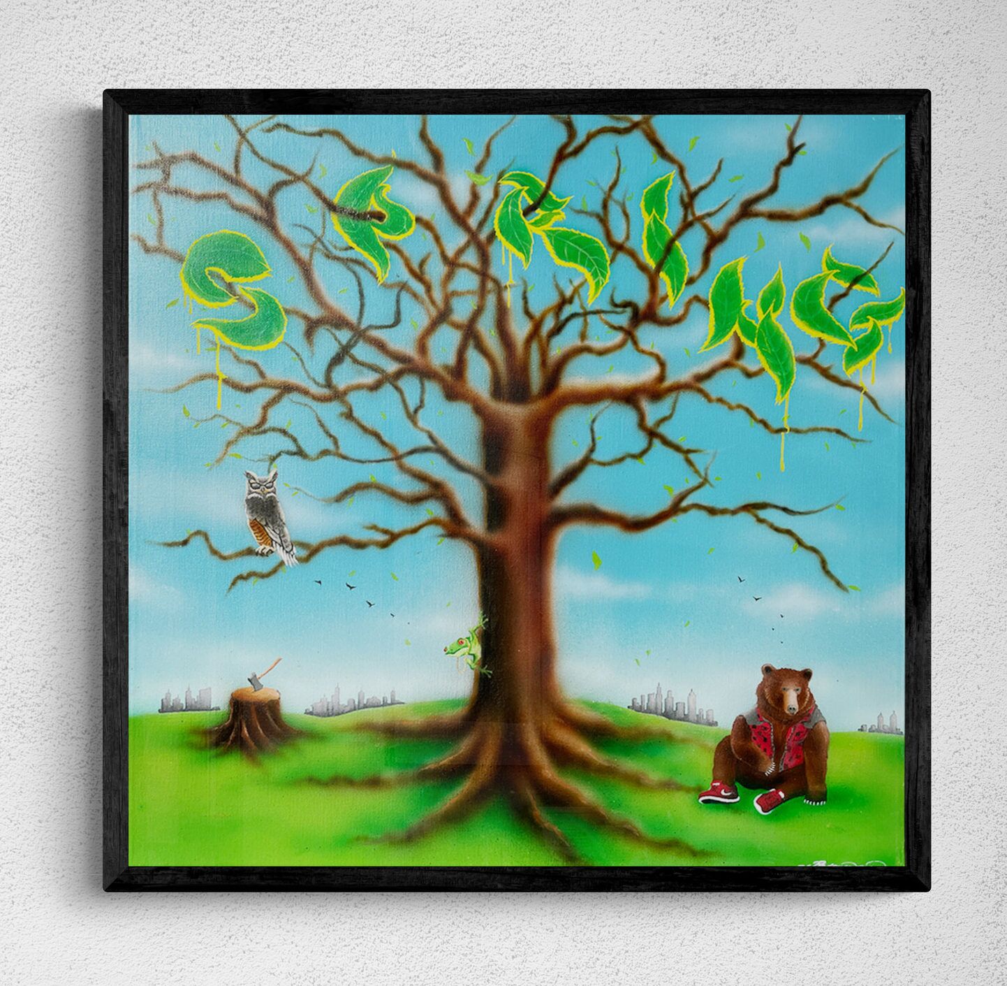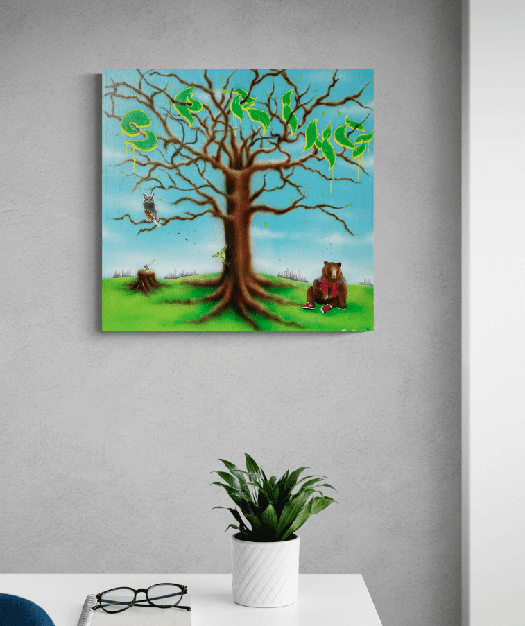 “Spring” – mindre størrelse maleri med graffiti inspirerede bogstaver formet som blade i træet. Bjørnen, uglen og de små detaljer i maleriet skaber en hyggelig forårs stemning med et strejf af nutidig surrealisme. Det andet ud af en serie med de 4 årstider som graffiti inspirerede malerier.