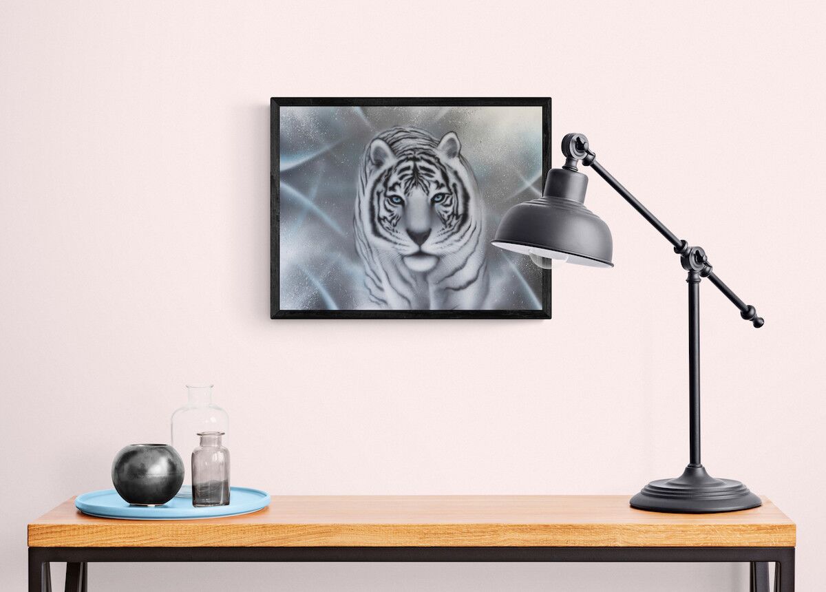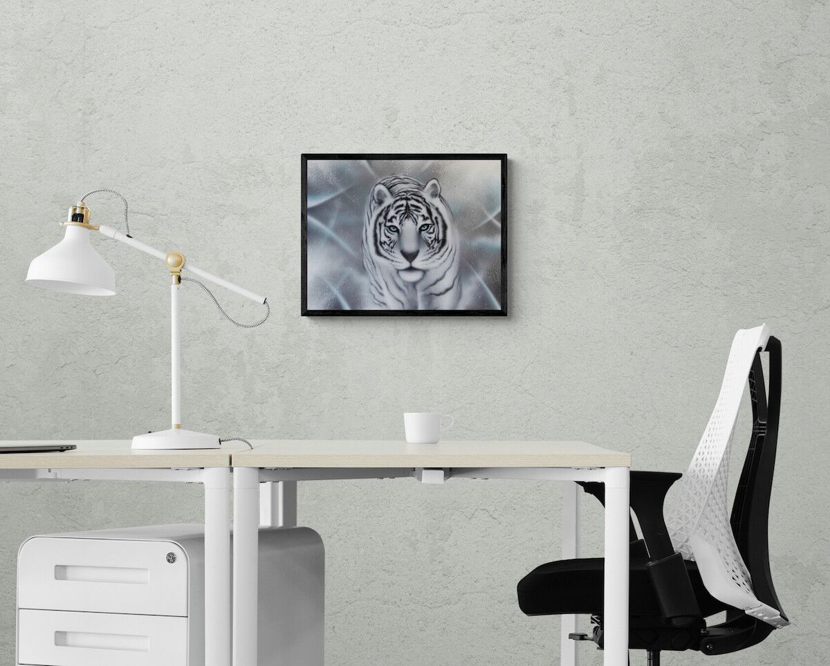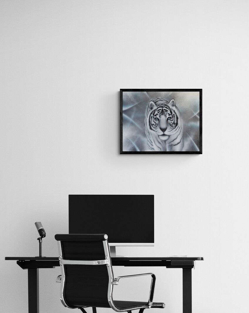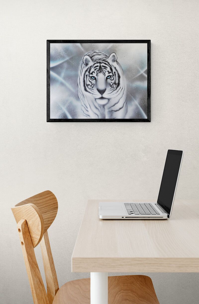 Giclèe kunst tryk af den hvide tiger, som symboliserer disciplin. Flot og stemningsfuldt kunst tryk. signeret af kunsteren BecomeOne. Begrænset oplag.