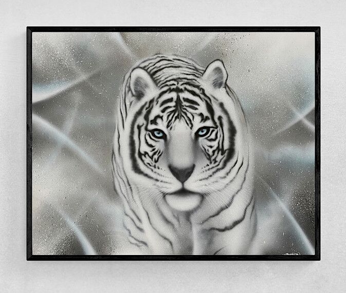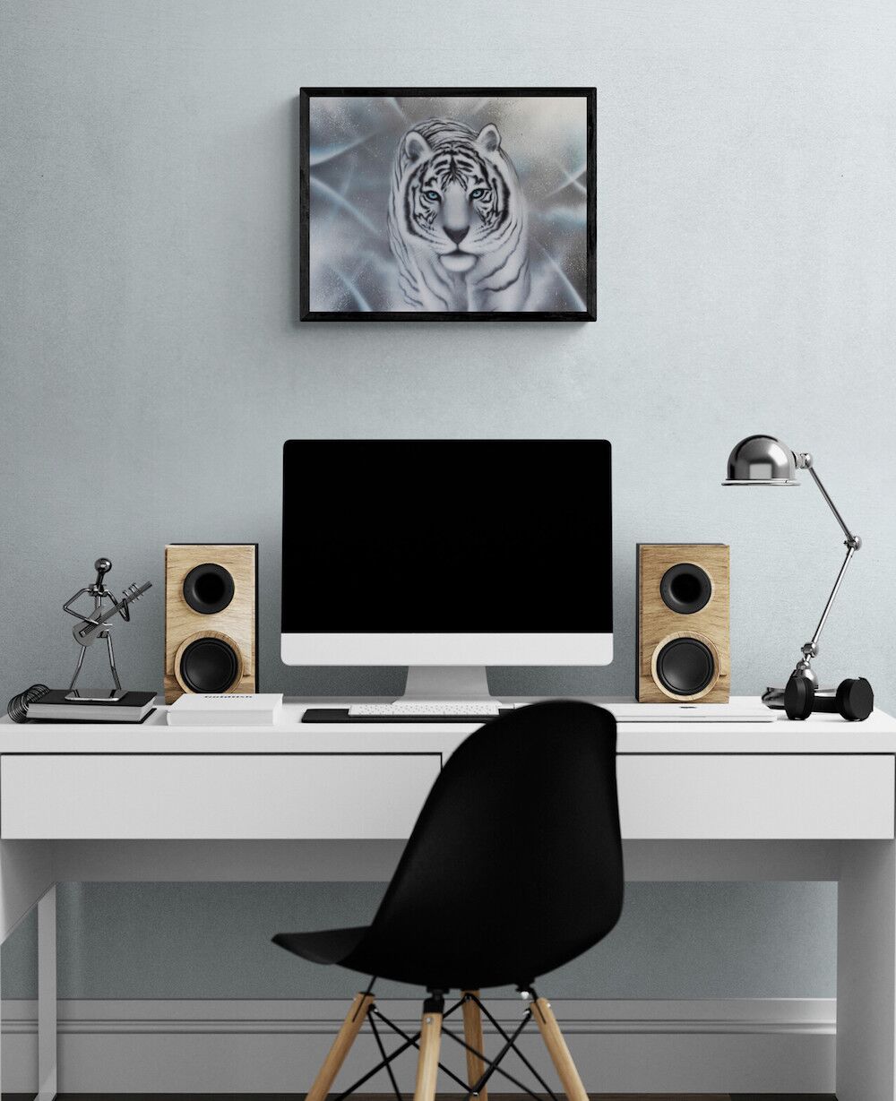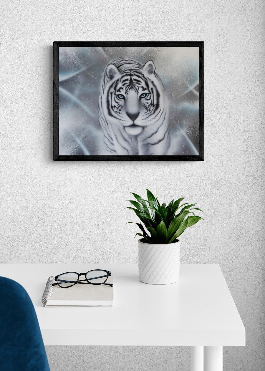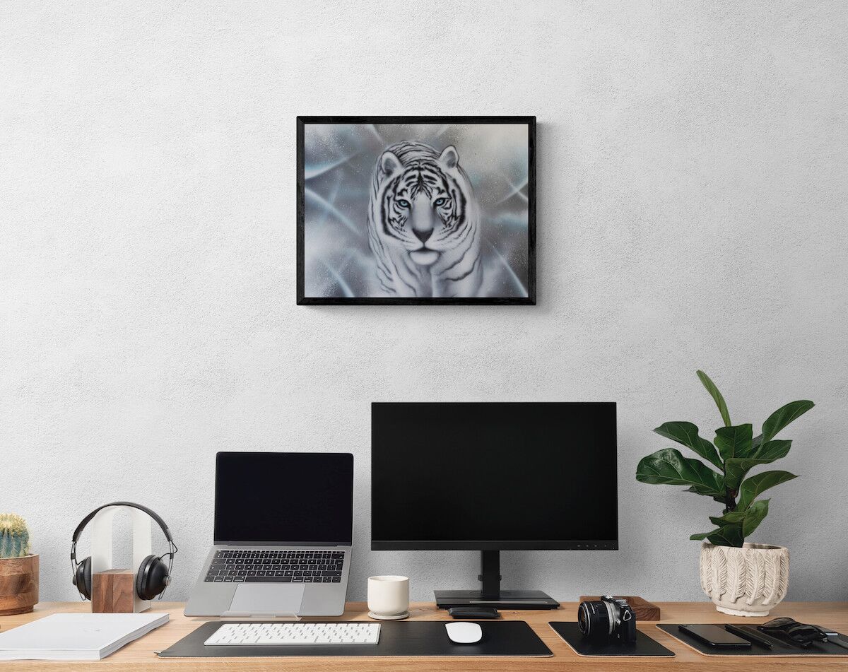 Giclèe kunst tryk af den hvide tiger, som symboliserer disciplin. Flot og stemningsfuldt kunst tryk. signeret af kunsteren BecomeOne. Begrænset oplag.
