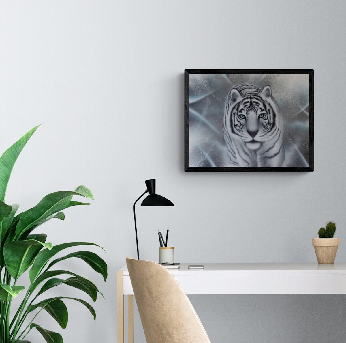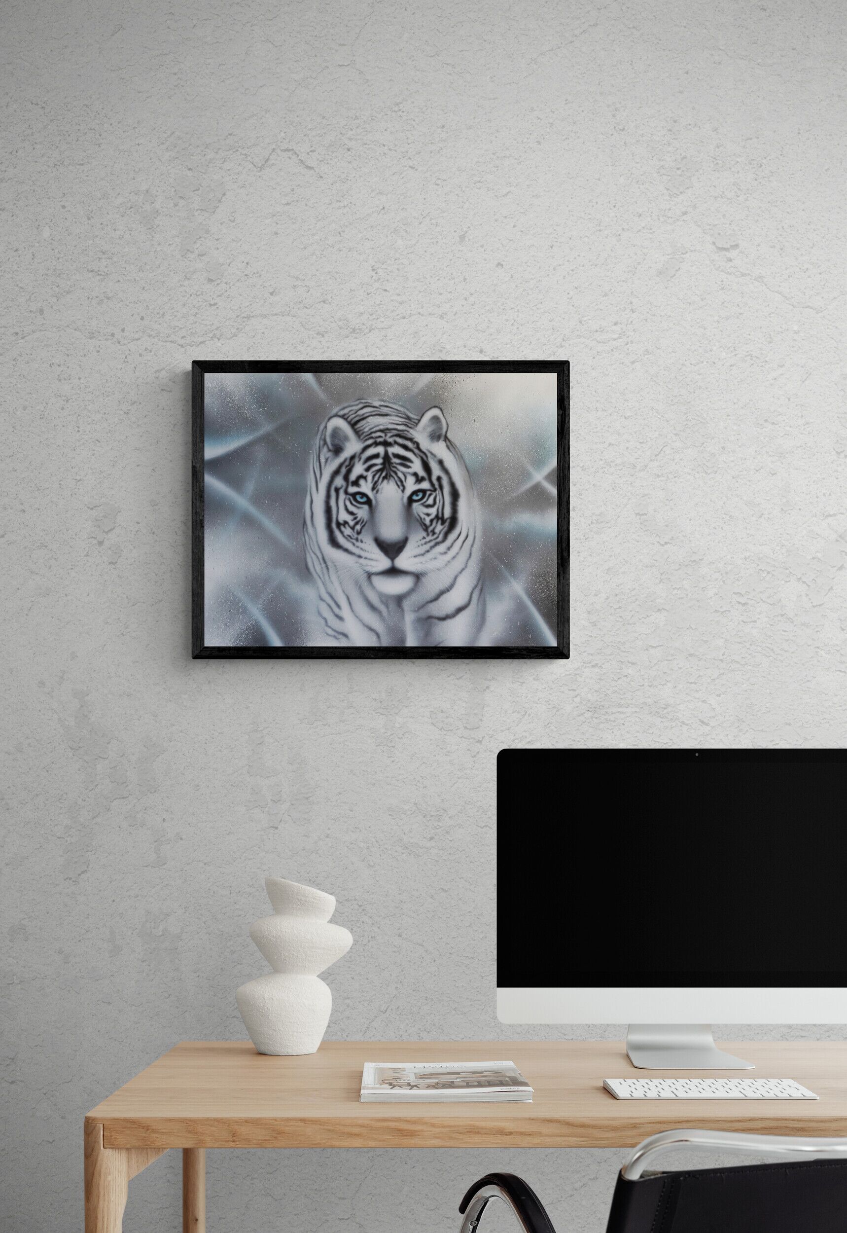 Dette sort/hvide kunsttryk af den hvide tiger symboliserer disciplin og viljestyrke. Jeg har altid været meget fascineret af tigere, da den på samme tid er det mest frygtindgydende og samtidig det flotteste og mest majestætiske dyr på jorden.