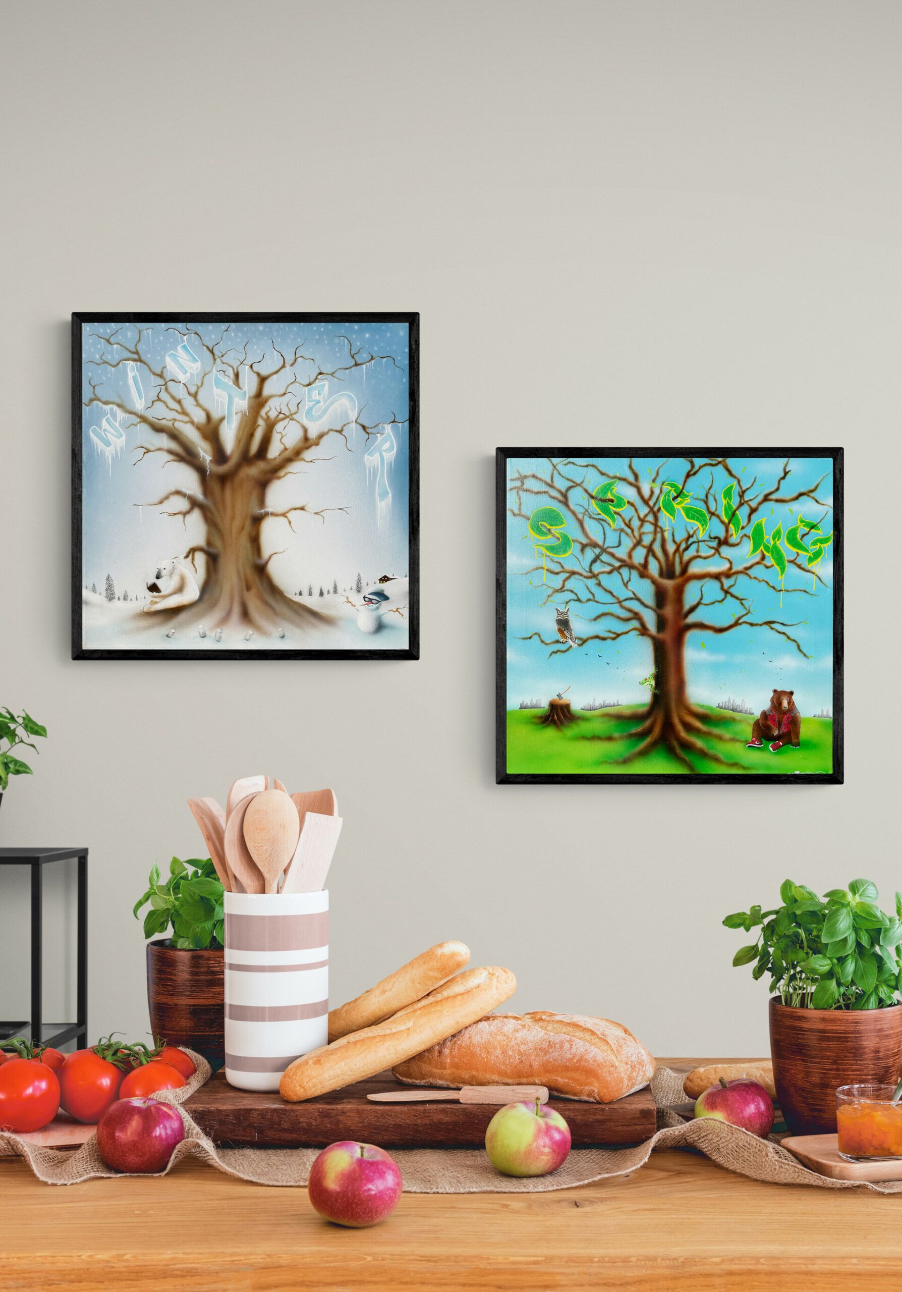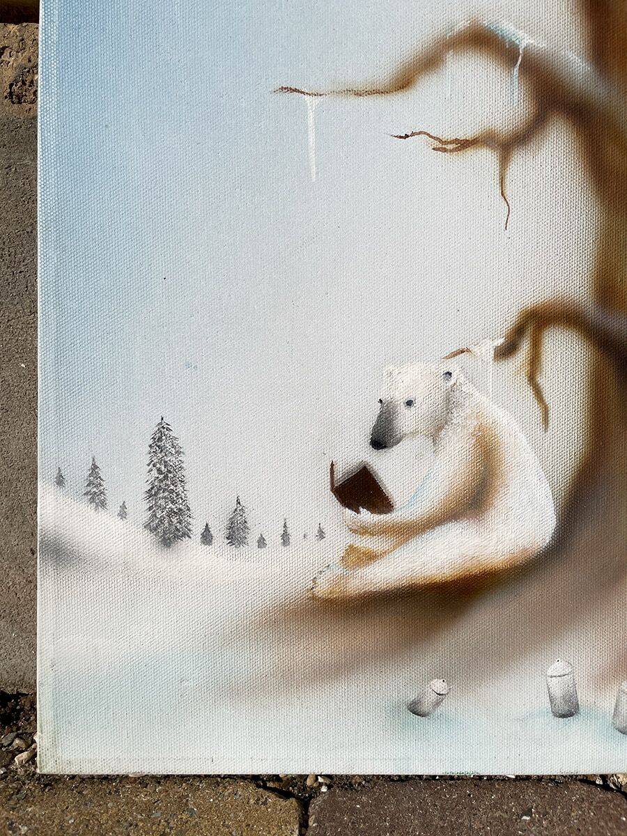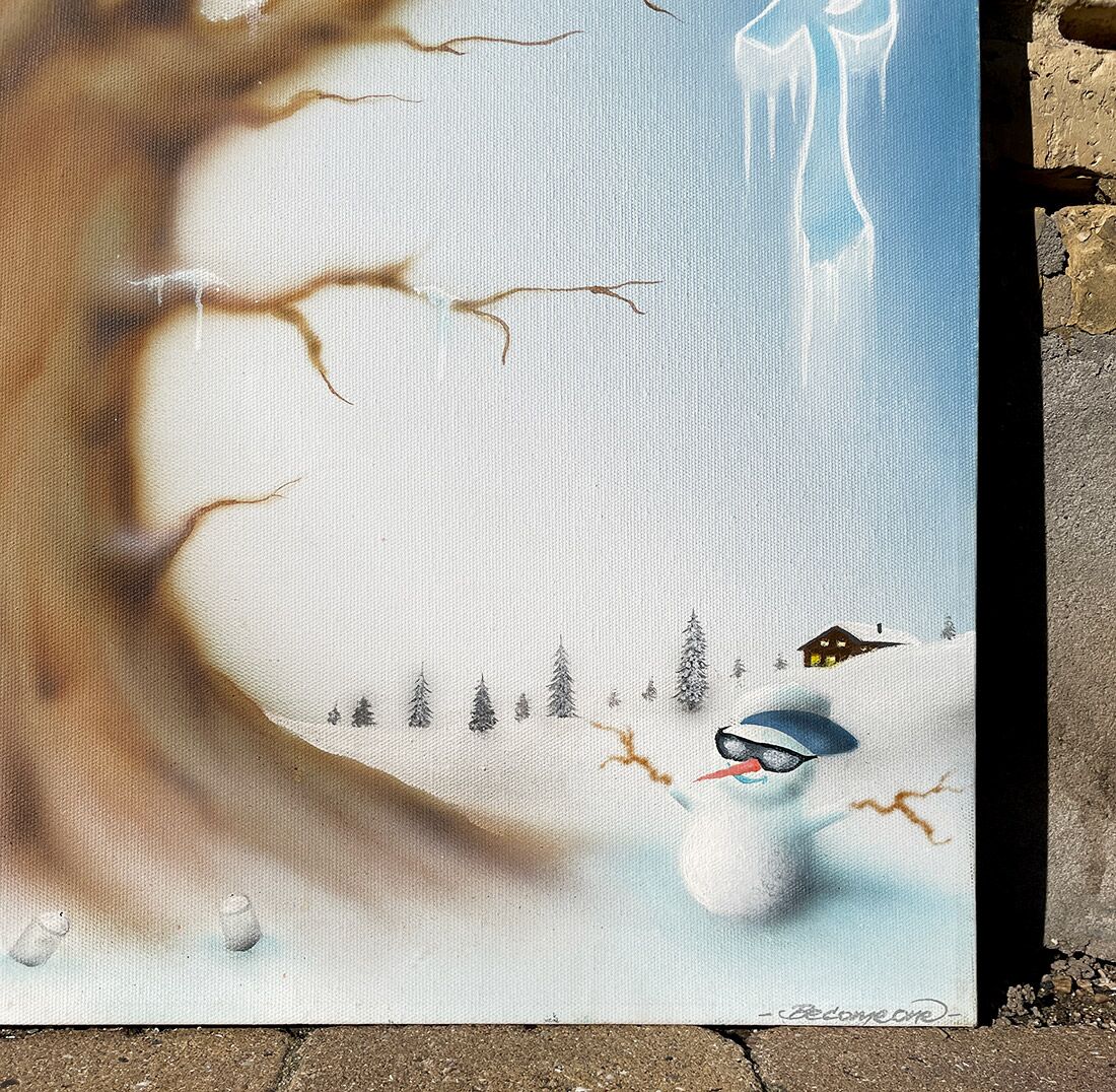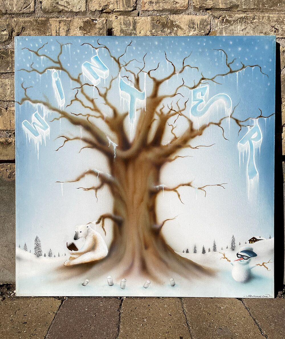 “Winter” – mindre størrelse maleri med graffiti inspirerede bogstaver frosset til is i træet. Isbjørnen, snemanden og de små detaljer i maleriet skaber en hyggelig vinter stemning. Det første ud af en serie med de 4 årstider som graffiti inspirerede malerier.