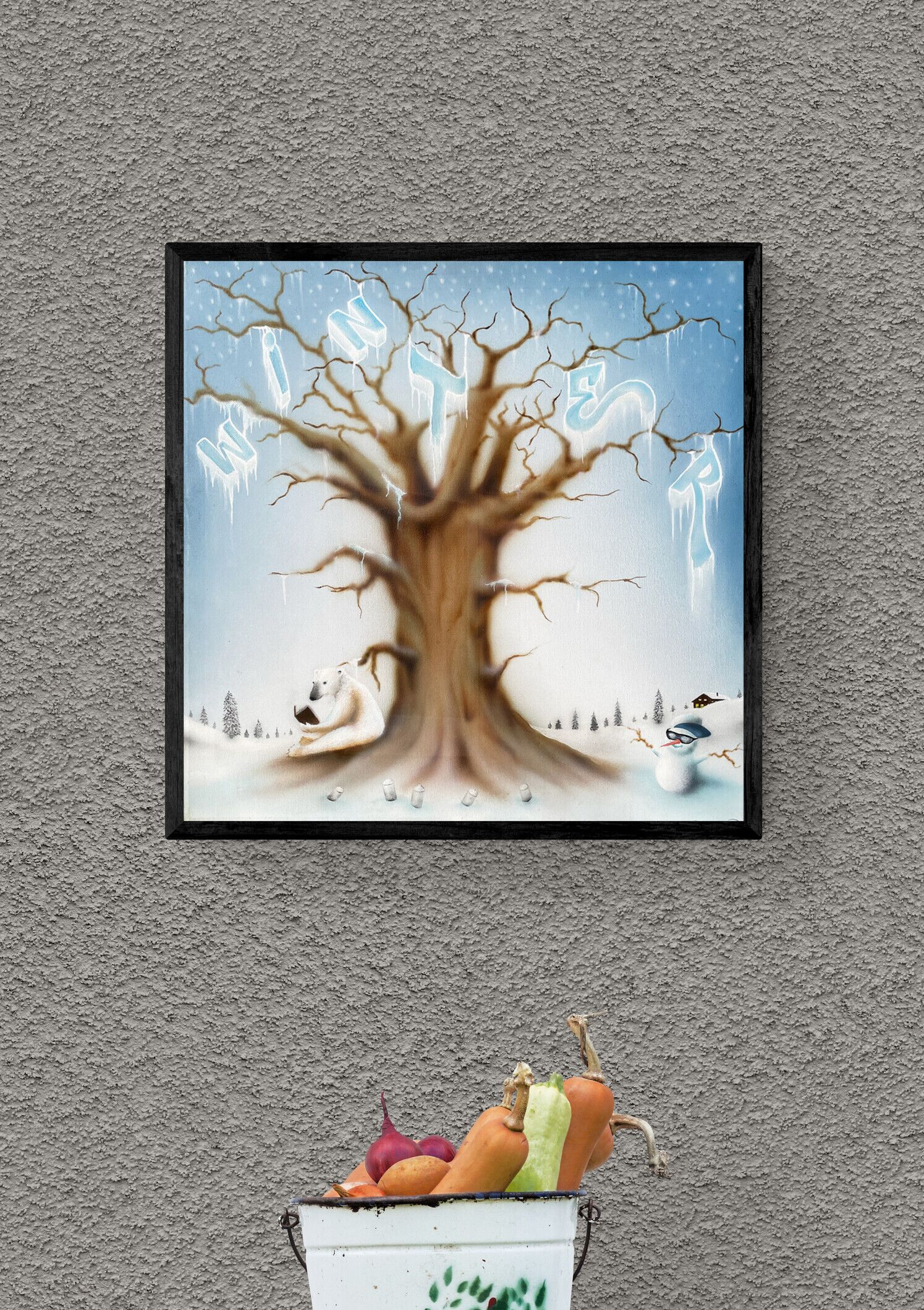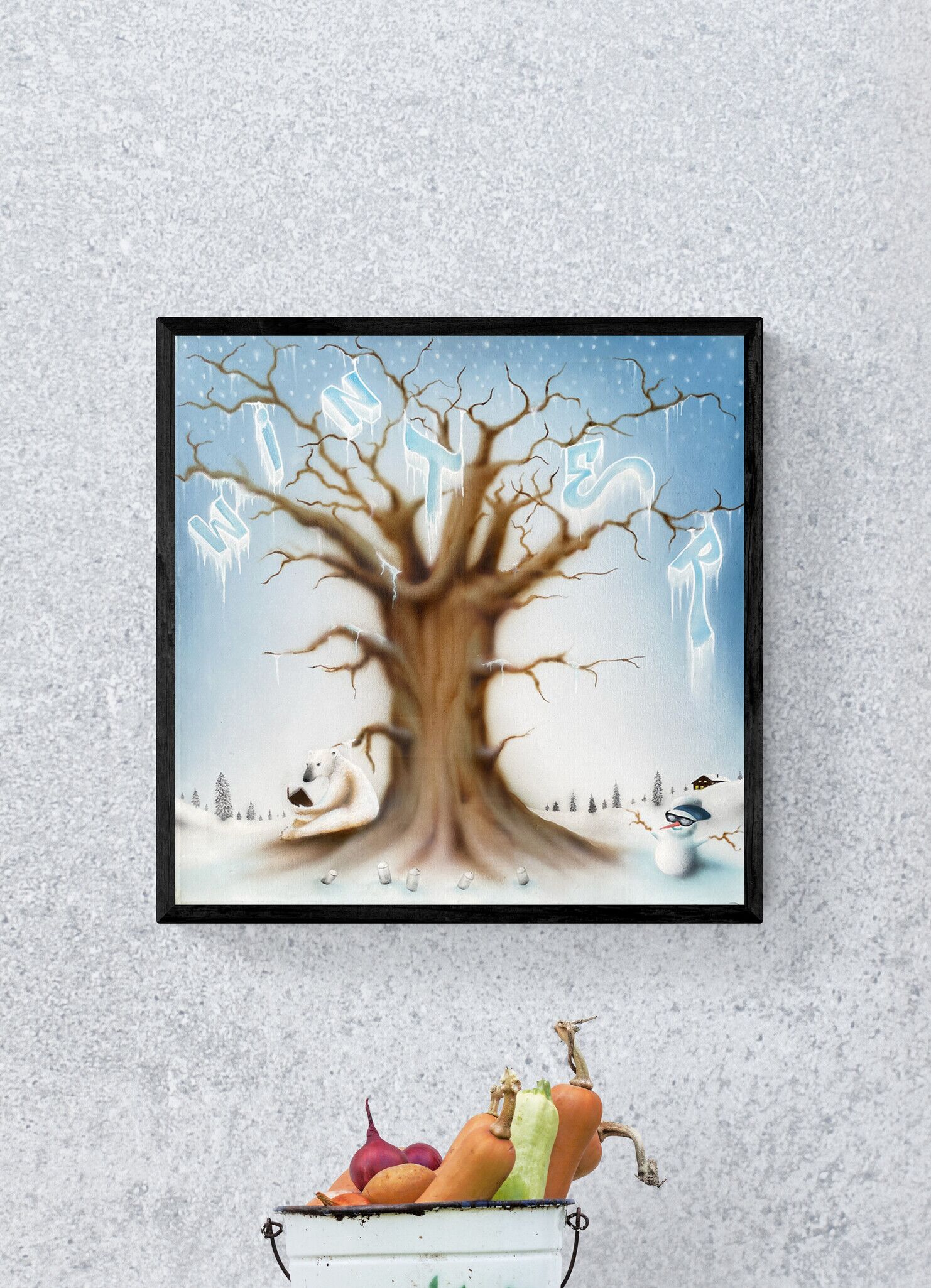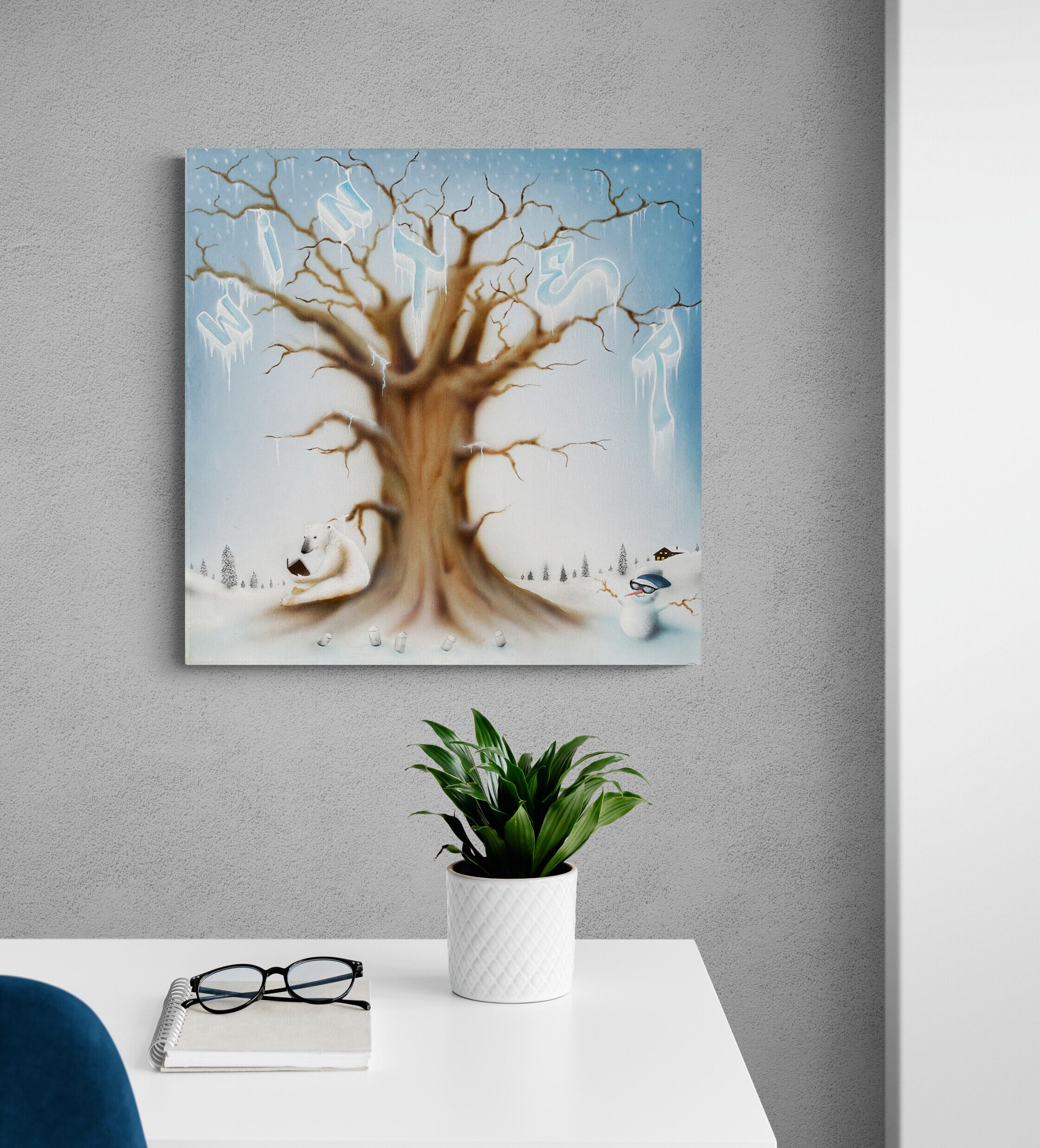 "Winter" - mindre størrelse maleri med graffiti inspirerede bogstaver frosset til is i træet. Isbjørnen, snemanden og de små detaljer i maleriet skaber en hyggelig vinter stemning. Det første ud af en serie med de 4 årstider som graffiti inspirerede malerier.