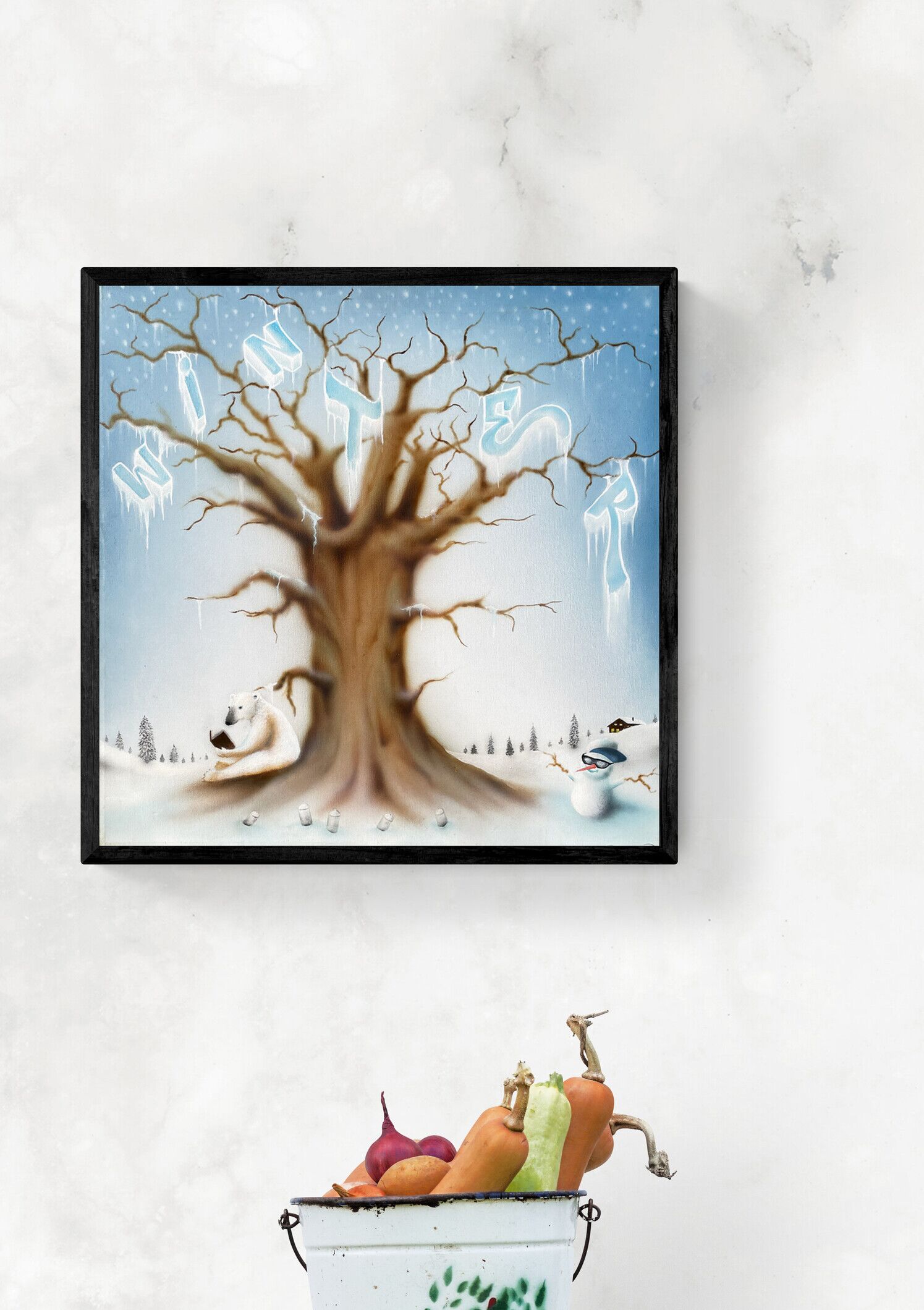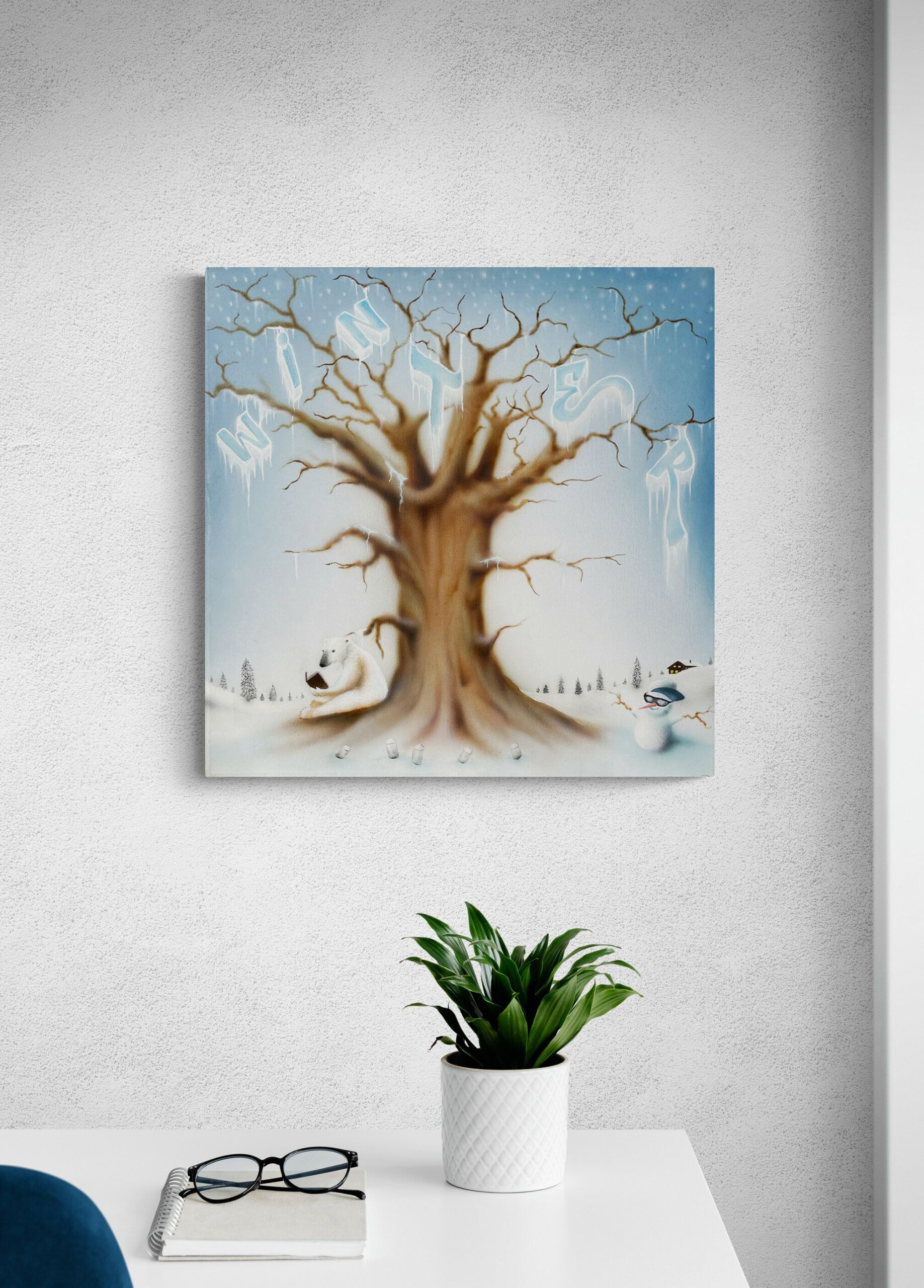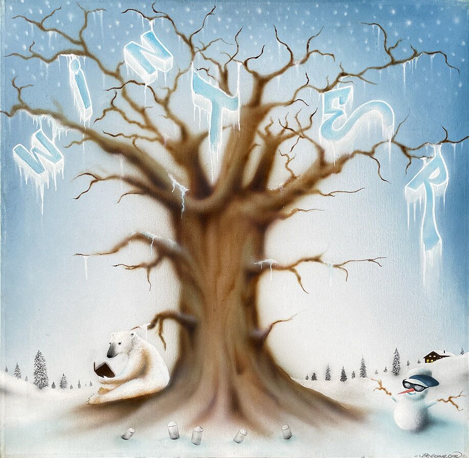 "Winter" - mindre størrelse maleri med graffiti inspirerede bogstaver frosset til is i træet. Isbjørnen, snemanden og de små detaljer i maleriet skaber en hyggelig vinter stemning. Det første ud af en serie med de 4 årstider som graffiti inspirerede malerier.